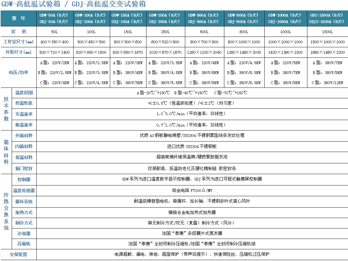 注:1、“GDW”為高低溫試驗箱型號/ “GDJ”為高低溫交變試驗箱型號。