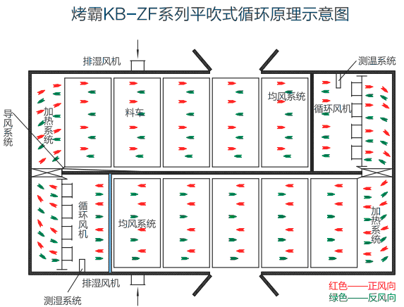 工作原理:傳統(tǒng)的烘烤設(shè)備用于干燥的熱風(fēng)往往通過烤房烤車底部向上一次吹過物料后全部排放。本烤房由兩組加熱系統(tǒng)與高溫高濕正反轉(zhuǎn)專用風(fēng)機組合(如圖)按照設(shè)定程序正反循環(huán)運行,正反向運行時間可自由設(shè)定。熱風(fēng)通過烤屜側(cè)面穿過物料形成烤房內(nèi)的正反轉(zhuǎn)熱風(fēng)循環(huán),采用平風(fēng)方式技術(shù),特別適用于不易透氣、不易烘烤的物。保證了整個烤房的物料不會因為遮擋而發(fā)生物料干燥不均勻、干燥的品質(zhì)不同步、烘烤時間過長、能耗過高。