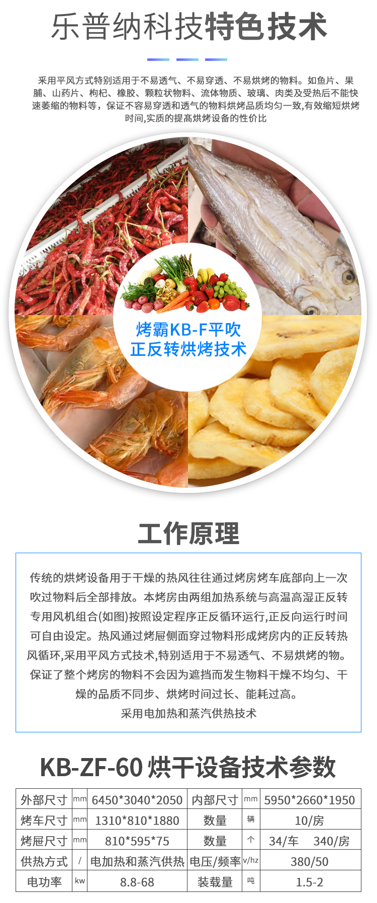 北京樂普納科技技術(shù)部根據(jù)大量的實際經(jīng)驗和市場需求,獨家設(shè)計出烤霸正反轉(zhuǎn)平吹式熱風(fēng)循環(huán)KB-ZF系列干燥設(shè)備。采用平風(fēng)方式特別適用于不易透氣、不易穿透、不易烘烤的物料。如:魚片、果脯、山藥片、枸杞、橡膠、顆粒狀物料、流體物質(zhì)、玻璃、肉類及受熱后不能快速萎縮的物料等??景訩B-ZF平吹正反轉(zhuǎn)烘烤技術(shù),進一步保證不容易穿透和透氣的物料烘烤品質(zhì)均勻一致,有效縮短烘烤時間,實質(zhì)的提高烘烤設(shè)備的性價比,是自動化大宗物料烘烤設(shè)備的最佳選擇。